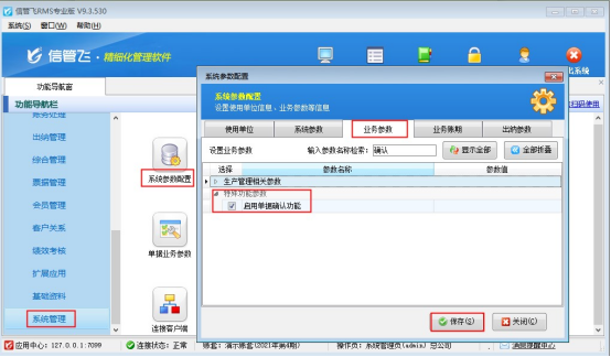 功能導(dǎo)航窗點(diǎn)擊“系統(tǒng)管理”—》“系統(tǒng)參數(shù)配置”,“業(yè)務(wù)參數(shù)”中特殊功能參數(shù)中勾選“啟用單據(jù)確認(rèn)功能”參數(shù),保存配置,如下圖: