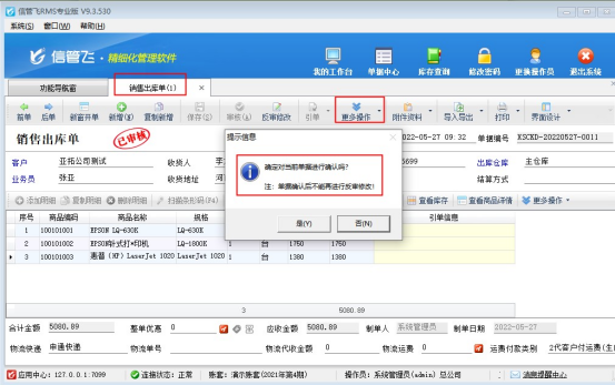 參數(shù)啟用完成后,銷售管理中新開一個(gè)銷售出庫單保存并審核,審核完成后在更多操作下點(diǎn)擊“確認(rèn)單據(jù)”,確認(rèn)單據(jù)時(shí)會(huì)提醒“單據(jù)確認(rèn)后不能再進(jìn)行反審修改!”,點(diǎn)擊“是”確認(rèn)單據(jù)完成,如下圖:
