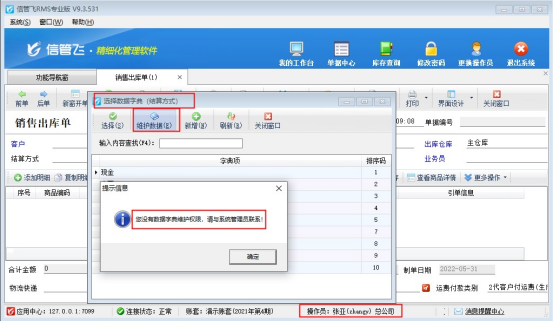 軟件默認(rèn)操作員沒有勾選“數(shù)據(jù)字典維護(hù)”權(quán)限,使用此操作員登錄,在新開單據(jù)界面。打開“結(jié)算方式”,點(diǎn)擊“維護(hù)”,會(huì)提示“您沒有數(shù)據(jù)字典維護(hù)權(quán)限,請(qǐng)與系統(tǒng)管理員聯(lián)系!”如下圖所示: