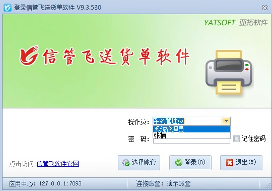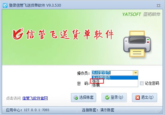 信管飛送貨單軟件在系統(tǒng)管理—操作員及授權中添加操作員及權限添加后,在軟件客戶端程序登錄界面,操作員列表可查看可登錄的所有操作員名字,如下圖所示: