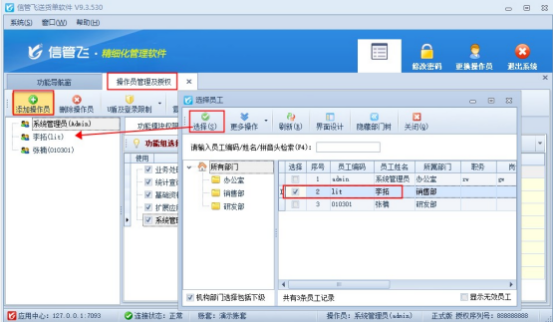 添加新的操作員,功能導航窗選擇系統(tǒng)管理—操作員及授權界面。點擊工具欄“添加操作員”,選擇員工信息中的“李拓”,選擇完成后,右側功能權限勾選需要的權限,保存設置則添加新的可登錄的操作員“李拓”,如下圖所示: