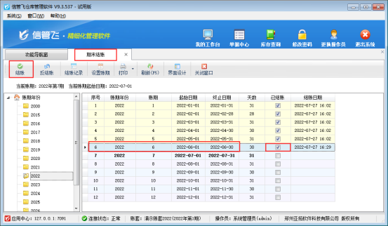 在功能導(dǎo)航窗點(diǎn)擊“基礎(chǔ)資料”—》“期末結(jié)賬”,進(jìn)入期末結(jié)賬界面,本文示例鎖定2022年6月份的單據(jù),在期末結(jié)賬界面,選擇賬期年份2022年6月,工具欄點(diǎn)擊“結(jié)賬”按鈕進(jìn)行操作結(jié)賬,結(jié)賬完成后,已結(jié)賬處顯示已勾選,賬期進(jìn)入2022年7月份,如下圖所示: