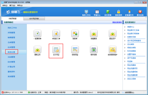 會(huì)計(jì)憑證是指記錄經(jīng)濟(jì)業(yè)務(wù)發(fā)生或完成情況的書面證明,包括原始憑證和記賬憑證,是登記賬簿的依據(jù)。會(huì)計(jì)憑證是記錄經(jīng)濟(jì)信息的載體;信管飛RMS專業(yè)版包含財(cái)務(wù)處理功能(使用賬務(wù)處理功能需要操作員具有一定的專業(yè)財(cái)務(wù)知識),可用來登記會(huì)計(jì)憑證。