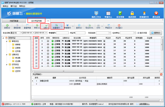 軟件內(nèi)的做賬流程為:憑證輸入—憑證審核—憑證過賬—結(jié)轉(zhuǎn)損益—期末結(jié)賬,結(jié)賬后賬期自動(dòng)進(jìn)入下一賬期。其中憑證過賬就是系統(tǒng)將已輸入的記賬憑證根據(jù)其會(huì)計(jì)科目登記到相關(guān)的明細(xì)賬薄中的過程,已過賬的憑證不允許再反審修改。如需要過賬的憑證較多,可使用批量過賬功能,本篇文章介紹一下如何批量過賬會(huì)計(jì)憑證?