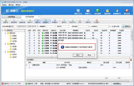 在會(huì)計(jì)憑證列表界面,首先點(diǎn)擊“批量操作”按鈕進(jìn)入批量操作模式,復(fù)選多個(gè)會(huì)計(jì)憑證,即勾選您需要過賬的會(huì)計(jì)憑證,然后點(diǎn)擊“過賬”按鈕,系統(tǒng)彈出提示信息“您確定對當(dāng)前選擇的會(huì)計(jì)憑證進(jìn)行“過賬”嗎?”,如下圖所示,點(diǎn)擊“是”按鈕,被勾選的會(huì)計(jì)憑證變?yōu)椤耙堰^賬”狀態(tài)。