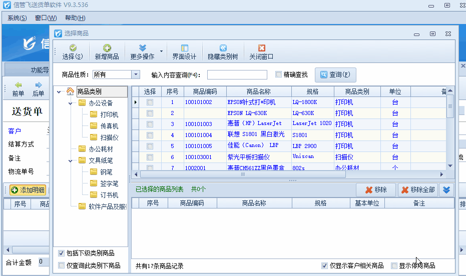 信管飛送貨單軟件開送貨單前可提前添加好商品信息到基礎(chǔ)資料中,新開送貨單選擇客戶后,選擇“添加明細”可彈出選擇商品界面,可選擇添加好的商品信息,有用戶反映在選擇商品界面,查詢窗口輸入商品簡寫不自動過濾,需要點擊下查詢才會進行檢索,如下圖所示: