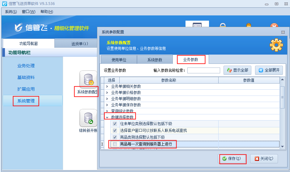 經(jīng)檢查發(fā)現(xiàn),原因是啟用了參數(shù)影響,解決辦法如下,在功能導(dǎo)航窗點擊“系統(tǒng)管理”—“系統(tǒng)參數(shù)配置”,在“業(yè)務(wù)參數(shù)”的選擇參數(shù)中取消勾選參數(shù)“商品每一次查詢到服務(wù)器上進行”,然后保存設(shè)置,如下圖所示: