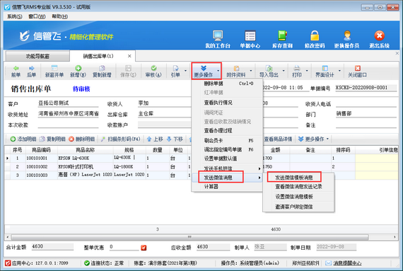 設(shè)置完成之后,使用操作員賬號(hào)“張亞”登錄軟件,打開(kāi)一個(gè)銷售出庫(kù)單,然后點(diǎn)擊“更多操作”→“發(fā)送微信消息”→“發(fā)送微信模板消息”進(jìn)行發(fā)送微信消息通知時(shí),系統(tǒng)會(huì)彈出提示信息“您沒(méi)有發(fā)送微信消息的權(quán)限,請(qǐng)于系統(tǒng)管理員聯(lián)系!”,如下圖所示。