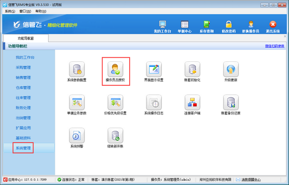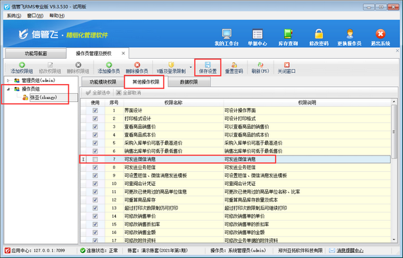 在功能導(dǎo)航窗點(diǎn)擊“系統(tǒng)管理”—》“操作員及授權(quán)”,可進(jìn)入“操作員管理及授權(quán)”界面,選中操作員賬號(hào),在“其他操作權(quán)限”界面將“可發(fā)送微信消息”權(quán)限打鉤取消,然后保存權(quán)限設(shè)置,如下圖所示,設(shè)置操作員“張亞”沒(méi)有“可發(fā)送微信消息”權(quán)限。