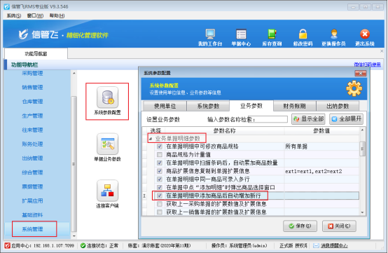 在功能導(dǎo)航窗點(diǎn)擊“系統(tǒng)管理”—》“系統(tǒng)參數(shù)設(shè)置”—》“業(yè)務(wù)參數(shù)”,然后在業(yè)務(wù)單據(jù)明細(xì)參數(shù)中啟用“在單據(jù)明細(xì)中添加商品后自動(dòng)增加新行”參數(shù),如下圖所示: