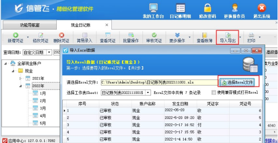 日記賬模板Excel文件導(dǎo)出選擇桌面,打開導(dǎo)出到桌面的Excel文件進(jìn)行整理之前的日記賬憑證,Excel導(dǎo)入必填項(xiàng)為賬戶名稱、發(fā)生日期(格式為:yyyy-mm-dd、憑證字、憑證號、摘要、收支類別、借貸方金額。整理完成后保存Excel文件并關(guān)閉,軟件日記賬界面,在工具欄“導(dǎo)入導(dǎo)出”按鈕選擇“從Excel導(dǎo)入憑證”,如下圖所示: