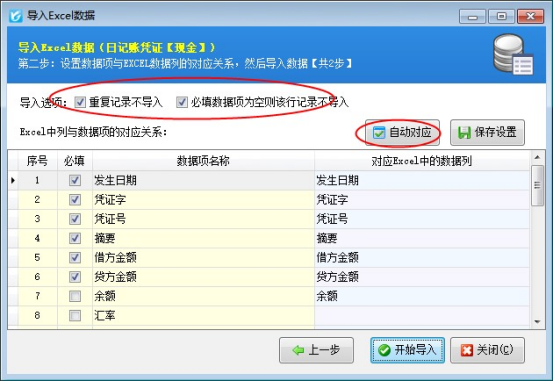 如果有多個(gè)資金賬戶,需要按資金賬戶進(jìn)行導(dǎo)入,選擇資金賬戶后選擇Excel文件,下一步進(jìn)行數(shù)據(jù)項(xiàng)對應(yīng),可以點(diǎn)擊“自動對應(yīng)”按鈕,可自動對應(yīng)Excel表頭內(nèi)容和軟件中數(shù)據(jù)項(xiàng),對應(yīng)完成點(diǎn)擊“開始導(dǎo)入”,導(dǎo)入完成有導(dǎo)入結(jié)果。如下圖所示: