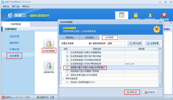 在功能導航窗點擊“系統管理”—》“系統參數配置”,“業務參數”中數據擇參數啟用參數“在選擇窗口僅顯示當前業務員的客戶”,保存配置,如下圖所示: