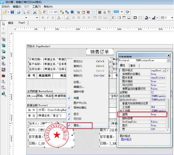 導航欄選擇“業務處理”—》“新開訂單”—》打印—》打印格式設計—》設計格式,進入打印模板的設計器界面,點擊左側工具欄的“插入圖片”把圖片放在設計器界面的蓋章位置中,如下圖所示: