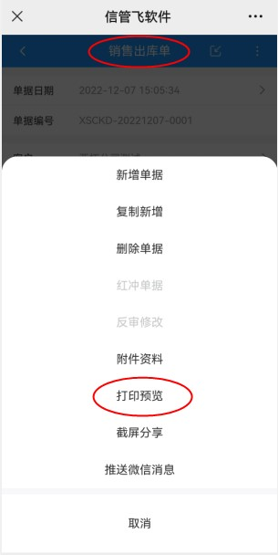 微信端登錄后,新增銷售出庫單并保存,點(diǎn)擊右上角的豎三點(diǎn)符號(hào),可彈出打印預(yù)覽操作界面。如下圖所示: