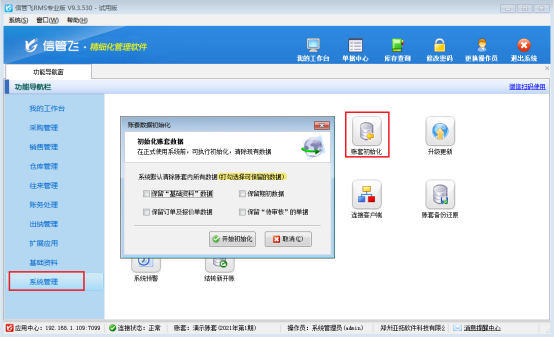 默認初始化會刪除所有的數(shù)據(jù)(包括基礎(chǔ)資料和業(yè)務(wù)單據(jù)),我們可以根據(jù)自己的實際需要去選擇需要保留和刪除的內(nèi)容,可打勾選擇要保留的數(shù)據(jù)內(nèi)容。點“開始初始化”等待軟件執(zhí)行完成即可,如下圖所示: