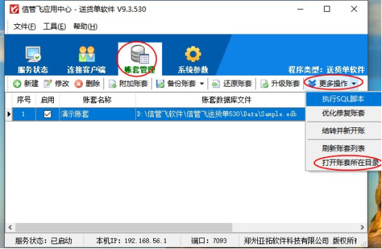 打開紅色圖標應用中心程序賬套管理界面,在賬套管理界面點擊“更多操作”選擇“打開賬套所在目錄”,可快速至賬套源文件夾中,如下圖所示: