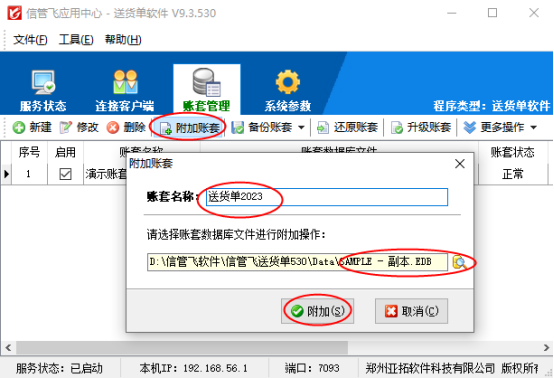 復制賬套完成后打開應用中心程序賬套管理界面,點擊“附加賬套”,選擇源文件副本進行附加,附加后可修改賬套名稱,示例賬套修改為:送貨單2023,如下圖所示: