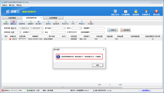參數設置完成后,重新打開收款結算單列表界面,對剛剛“已紅沖”的收款結算單進行刪除,此時就可以刪除成功了,如下圖所示: