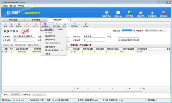 在收款結算單界面工具欄點擊“更多操作”—》“紅沖單據”,紅沖收款結算單,收款結算單紅沖后,在工具欄點擊“更多操作”—》“刪除單據”,可將此收款結算單刪除,如下圖所示。