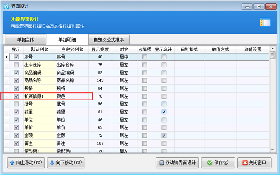 工具欄點擊“界面設(shè)計”—》“單據(jù)明細(xì)”,找到“自定義列名”為“顏色”的數(shù)據(jù)項,可查看“顏色”項的默認(rèn)列名為“擴展信息1”。