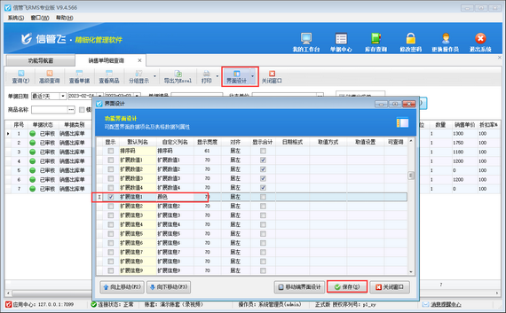 打開銷售明細(xì)查詢界面,工具欄點擊“界面設(shè)計”可以打開界面設(shè)計窗口,同樣找到默認(rèn)列名為“擴展信息1”的數(shù)據(jù)項,將自定義列名修改為“顏色”,并勾選“顯示”出來,然后點擊“保存”按鈕保存界面設(shè)計配置。