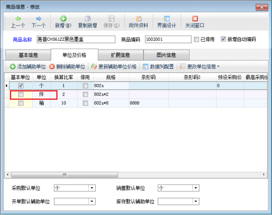 未開單使用過的輔助單位可以在單位及價格界面,單位、換算比率處直接進(jìn)行修改。