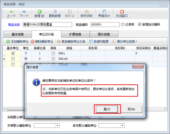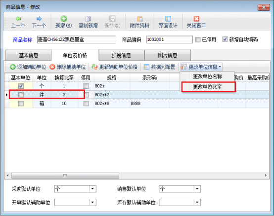 在“商品信息修改”窗口,點擊“單位及價格”,進(jìn)入單位及價格界面,選中輔助單位,點擊“更改單位信息”——》“更改單位比率”。