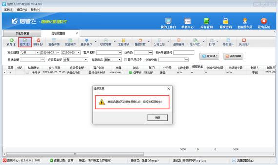 有用戶在修改應收款時,會遇到無法修改的情況,系統(tǒng)彈出提示信息“當前記錄為其它操作員錄入的,您沒有權限修改!”,如下圖所示。