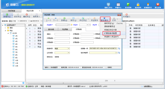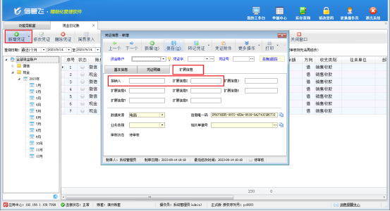 保存以后,在功能導(dǎo)航欄點擊“出納管理”進入日記賬界面,新增日記賬,在新增憑證窗口顯示“擴展信息”頁面可以錄入憑證的擴展信息,如下圖所示: