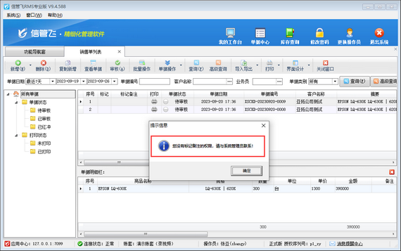 信管飛RMS支持對銷售單列表、采購單列表、銷售訂單列表以及采購訂單列表等標(biāo)記備注,有用戶在標(biāo)記單據(jù)備注時無法標(biāo)記,系統(tǒng)彈出提示信息“您沒有標(biāo)記備注的權(quán)限,請與系統(tǒng)管理員聯(lián)系!”如下圖所示: