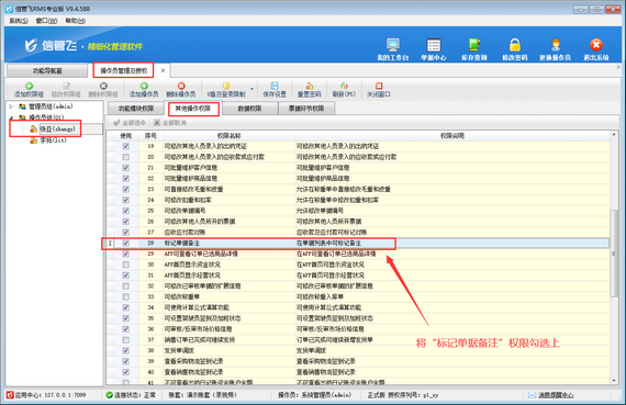 出現(xiàn)此問題的原因是:當(dāng)前登錄的操作員賬號沒有標(biāo)記單據(jù)備注權(quán)限,解決方法如下:使用系統(tǒng)管理員賬號登錄軟件,在功能導(dǎo)航窗點擊“系統(tǒng)管理”—》“操作員及授權(quán)”打開操作員管理及授權(quán)界面,選擇操作員賬號,在“其他操作權(quán)限”界面將“標(biāo)記單據(jù)備注”權(quán)限勾選上,然后保存權(quán)限設(shè)置,如下圖所示。