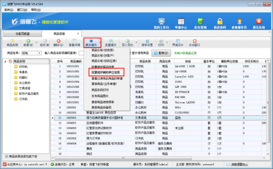 在商品信息界面,點擊工具欄“更多操作”下的“批量維護(hù)輔助單位信息”,可進(jìn)入批量維護(hù)輔助單位界面。如下圖所示: