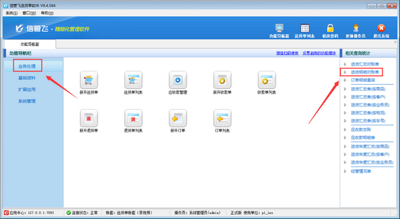 在功能導航窗打開“業務處理”模塊,然后在業務處理模塊右側相關查詢統計內點擊“送貨明細對賬單”打開送貨明細對賬單界面,如下圖所示。