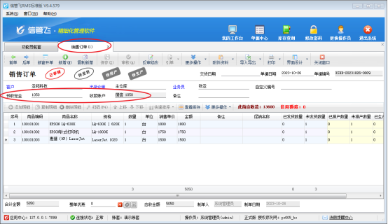 在功能導航窗點擊“銷售管理”—》“銷售訂單”,進入銷售訂單管理界面,點擊新增按鈕,新增一個銷售訂單,錄入預收定金,如圖所示: