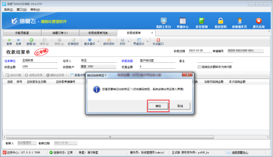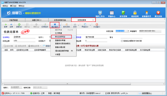 在收款結算單“更多操作”下點擊“轉記出納憑證”,點擊“確定”會彈出出納憑證新增界面,點擊保存即可,如下圖所示: