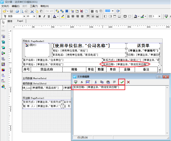 在單據(jù)開單界面選擇打印—》打印格式設(shè)計—》設(shè)計格式,進入打印模板的設(shè)計器界面,雙擊發(fā)貨日期文本框,調(diào)用“單據(jù)主體•物流發(fā)貨日期”,如下圖所示: