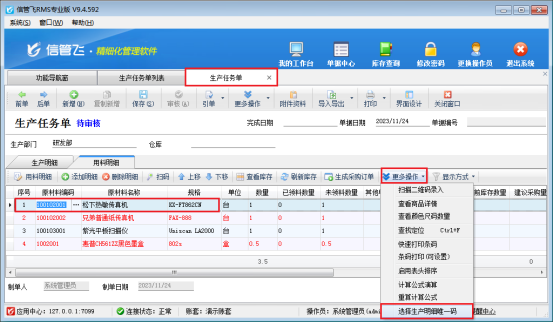 在功能導(dǎo)航欄點(diǎn)擊生產(chǎn)管理--生產(chǎn)任務(wù)單,在生產(chǎn)任務(wù)單界面選擇用料明細(xì),點(diǎn)擊更多操作下-----選擇生產(chǎn)明細(xì)唯一碼,每一條用料明細(xì)都需要對應(yīng)生產(chǎn)明細(xì)唯一碼,然后保存任務(wù)單,如圖所示: