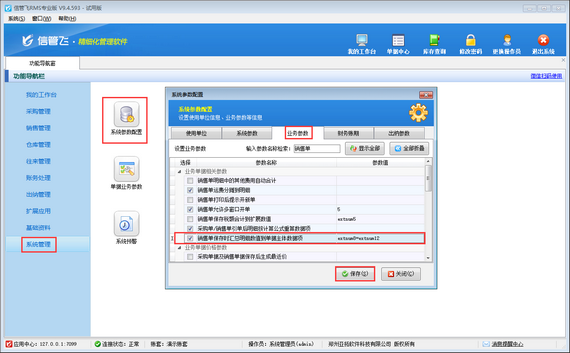 在功能導(dǎo)航窗點(diǎn)擊“系統(tǒng)管理”—》“系統(tǒng)參數(shù)配置”—》“業(yè)務(wù)參數(shù)”打開(kāi)業(yè)務(wù)參數(shù)配置界面,在“業(yè)務(wù)單據(jù)相關(guān)參數(shù)”內(nèi)啟用參數(shù)“銷售單保存時(shí)匯總明細(xì)數(shù)值到單據(jù)主體數(shù)據(jù)項(xiàng)”,并設(shè)置參數(shù)值,默認(rèn)是“extnum8=extnum12”(指匯總“單據(jù)明細(xì).擴(kuò)展數(shù)值12”數(shù)值合計(jì)到“單據(jù)主體.擴(kuò)展數(shù)值8”)。