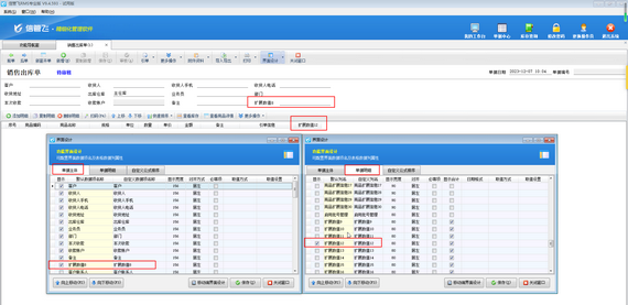 參數(shù)設(shè)置好之后,在功能導(dǎo)航窗點(diǎn)擊“銷售管理”—》“銷售出庫(kù)單”,在打開(kāi)的銷售出庫(kù)單界面工具欄點(diǎn)擊界面設(shè)計(jì),在界面設(shè)計(jì)內(nèi)將“單據(jù)主體.擴(kuò)展數(shù)值8”以及“單據(jù)明細(xì).擴(kuò)展數(shù)值12”勾選顯示出來(lái),如下圖所示。