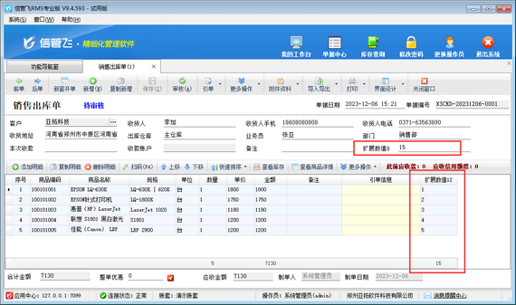 界面配置完成后,填開(kāi)銷售單,保存時(shí),系統(tǒng)即可自動(dòng)將“單據(jù)明細(xì).擴(kuò)展數(shù)值12”匯總合計(jì)值存儲(chǔ)到“單據(jù)主體.擴(kuò)展數(shù)值8”內(nèi),如下圖所示。