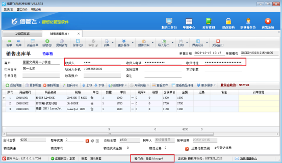 使用操作員賬號(hào)重新登錄軟件,可查看單據(jù)主體客戶收貨人、電話、地址等信息,如圖所示: