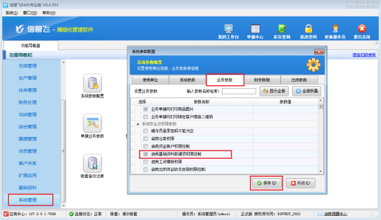 出現(xiàn)此問(wèn)題的原因是:當(dāng)前登錄的操作員沒(méi)有查看客戶基礎(chǔ)資料權(quán)限,解決方法如下:使用系統(tǒng)管理員賬號(hào)登錄軟件,在功能導(dǎo)航窗點(diǎn)擊“系統(tǒng)管理”—》“系統(tǒng)參數(shù)配置”—》“業(yè)務(wù)參數(shù)”勾選參數(shù)“啟用基礎(chǔ)資料數(shù)據(jù)項(xiàng)權(quán)限控制”,如圖所示: