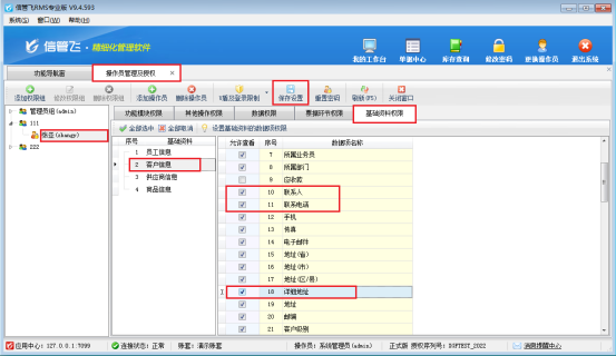 在功能導(dǎo)航窗點(diǎn)擊“系統(tǒng)管理”—》“操作員及授權(quán)”打開(kāi)操作員管理及授權(quán)界面,選擇操作員賬號(hào),在“基礎(chǔ)資料權(quán)限”界面將“客戶信息”權(quán)限勾選上聯(lián)系人、聯(lián)系電話、詳細(xì)地址等權(quán)限,然后保存權(quán)限設(shè)置,如圖所示:
