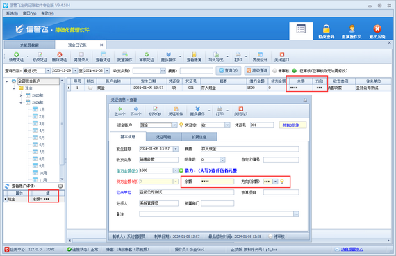 權(quán)限設(shè)置完成后,使用操作員賬號(hào)重新登陸軟件,即可查看出納日記賬資金賬戶余額,如下圖所示: