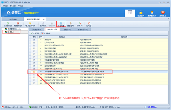 解決方法如下:使用系統(tǒng)管理員賬號(hào)登錄軟件,在功能導(dǎo)航窗點(diǎn)擊“系統(tǒng)管理”—》“操作員及授權(quán)”打開操作員管理及授權(quán)界面,選擇操作員賬號(hào),在“其他操作權(quán)限”界面將“不可查看出納日記賬資金賬戶余額”權(quán)限勾選取消,然后保存權(quán)限設(shè)置,如下圖所示: