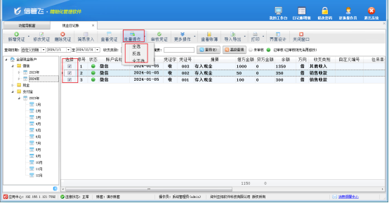 在功能導航窗點擊“出納管理”—》“現金日記賬”,打開現金日記賬界面,首先點擊“批量操作”按鈕進入批量操作模式,復選多個憑證記錄,也可直接進行全選、反選、全不選操作,之后點擊“更多操作”—》“反審憑證”,反審后,憑證狀態變為“未審核”,此時可以對未審核的憑證進行修改、刪除等操作。