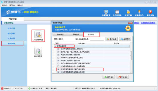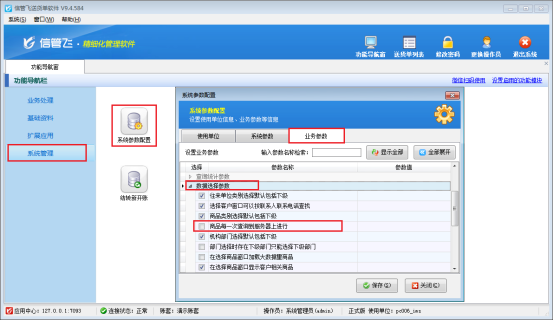 在功能導(dǎo)航窗點擊“系統(tǒng)管理”—》“系統(tǒng)參數(shù)配置”—》“業(yè)務(wù)參數(shù)”,即可進入到“業(yè)務(wù)參數(shù)”配置界面,在數(shù)據(jù)選擇參數(shù)內(nèi)取消勾選“商品每一次查詢到服務(wù)器上進行”參數(shù),然后點擊“保存”按鈕保存設(shè)置,如下圖2所示: