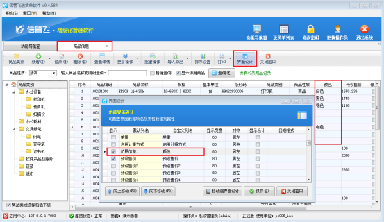 在功能導航窗點擊“業務處理”—》“送貨匯總表(按商品)”打開送貨匯總表(按商品)界面,然后在工具欄點擊“界面設計”,找到“商品擴展信息1”數據項,自定義列名修改為“顏色”并勾選顯示出來即可,如下圖所示。