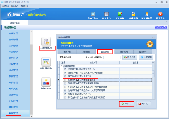 功能導(dǎo)航窗點(diǎn)擊“系統(tǒng)管理”“系統(tǒng)參數(shù)配置”,打開(kāi)“業(yè)務(wù)參數(shù)”,在數(shù)據(jù)選擇參數(shù)中取消勾選參數(shù)“在選擇商品窗口可查看庫(kù)存數(shù)量”,保存參數(shù)配置,如下圖所示: